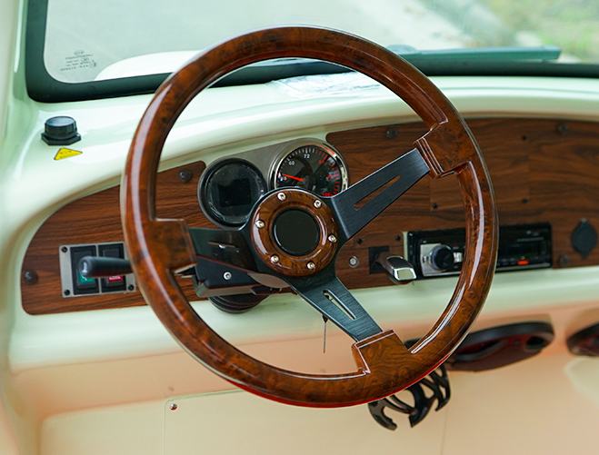 玻璃鋼車身前度高,耐腐蝕,壽命長。 全車采用汽車級優質油漆,電腦調漆,專業噴涂設備,烤漆工藝,色彩亮麗,歷久彌新。 專利前橋及懸掛,不磨輪胎。 整體式后橋、無縫焊接橋